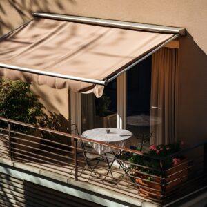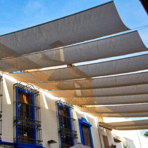 По конструкции ближе к рулонным шторам. Полотно на крыше или в боковой части двигается по пазам направляющих и складывается воланами. Такая конструкция намного легче, но также хорошо защищает от солнца, дождя. Ткань подбирают не только по оттенку, но и по степени прозрачности, это позволяет регулировать освещение.